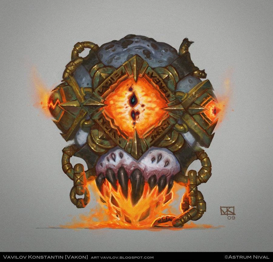 - При Желтом взгляде идет защит от физ. урона. - При Зеленом взгляде идет защита от Яда и Болезни. Скилы: Также босс набирает баф (Ярость огня), данный баф набираеться при: 1) Когда наносят урон такого типа от которого стоит резист. 2) Через 360 секунд начинает набирать по 2 стака вне зависимости от внешней обстановки. По идее, после, выживают: Палы(барьеры), Жрецы(бабл), Некры(Бессмертие), Маги(Иллюзии), Вары(Орешек). При наборе в 10 стаков происходит БУМ! и все умирают, опять же, есть шанс спастись у тех же класов описанных выше. Босс имеет один спам скил "Радужные молнии", механика скила как и у магов, при ударе по одной цели урон распространяется на ближних игроков. Важно! Снимайте Крупицы Света. Также в желтую фазу на Оке появляются горгульи и глаза. Убивать, контролить, или забить на них, решайте сами.